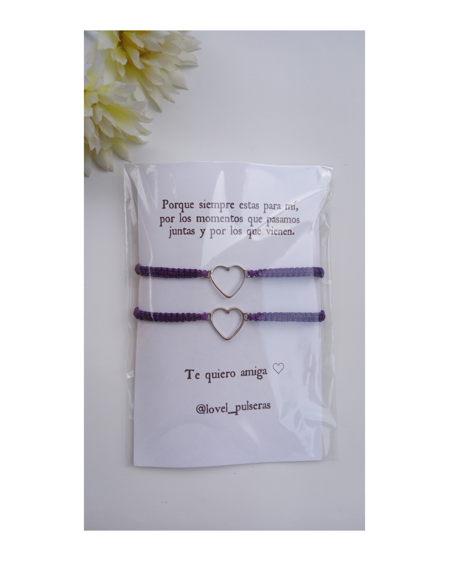 Pulseras regulables de hilo encerado, trenzado simple color violeta con dijes de metal de corazones.